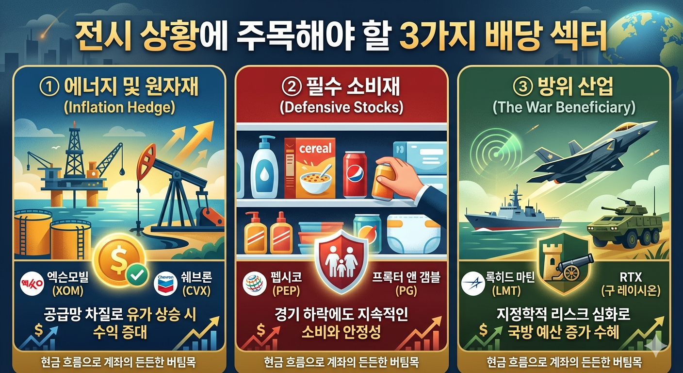 저 와는 달리 주식 고수들은 이 시기에 차트에 매달려 감정적인 소모를 하는 대신 주식창을 끄고 자신의 '현금 흐름'을 점검한다는 걸 알게 되었습니다. 전쟁 중에도 세상은 돌아가고, 누군가는 에너지를 쓰며, 누군가는 밥을 먹기 때문입니다. 오늘은 과거의 경험을 통해 변동성 장세에서 내 계좌의 든든한 버팀목이자 우리의 정신적 지주가 되어줄 **'전시 배당주'**에 대해 자세하게 알아보도록 하겠습니다.